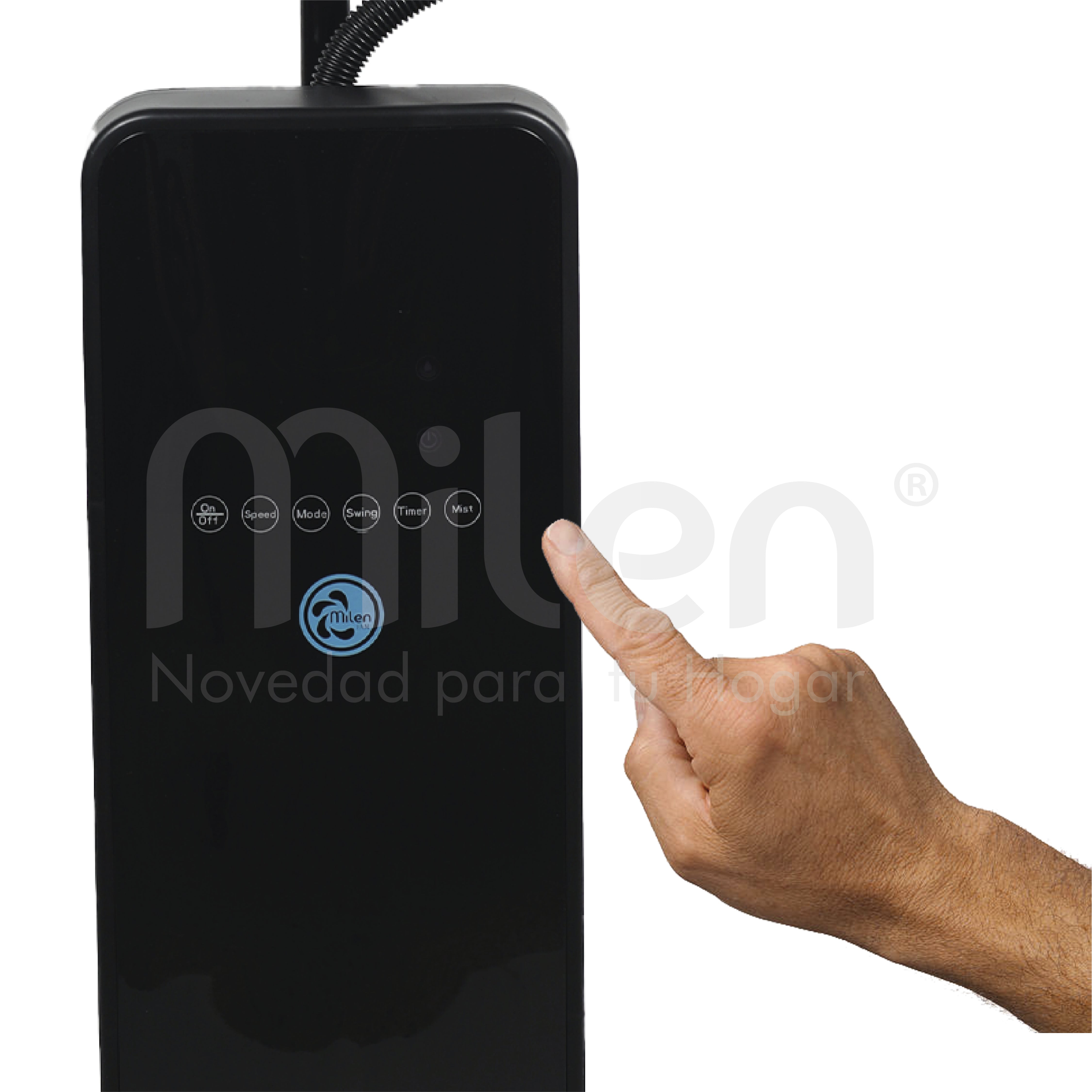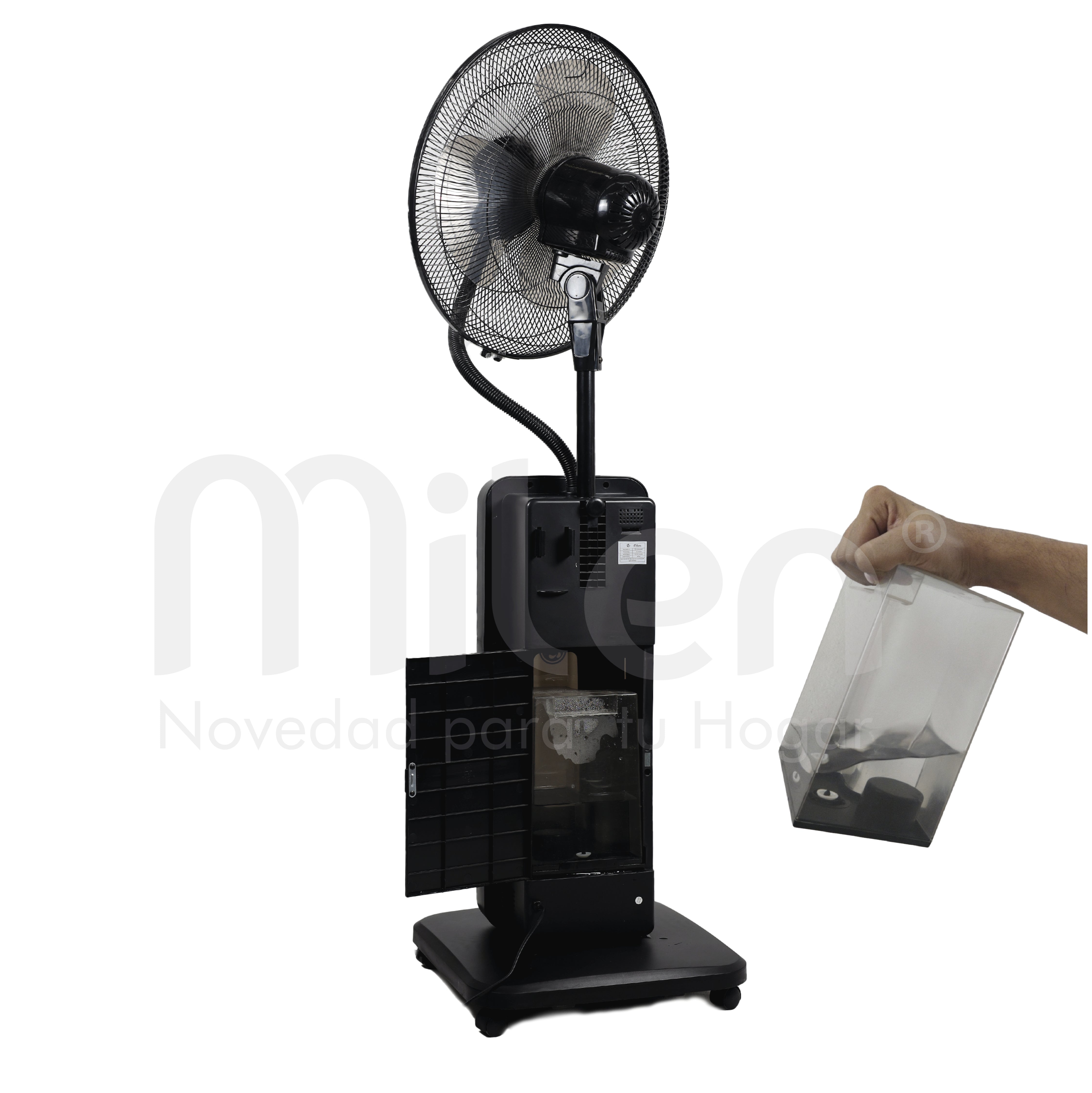 TX-1601 MF Ventilador Nebulizador Milen® silencioso de 3 velocidades: con 3 ajustes de velocidad,este ventilador te permite personalizar tus necesidades de brisa, y controlar las opciones de refrigeración con alta eficiencia energética en tu casa, sala de estar y oficina. Equipado con aspas de alta calidad y potente motor, este ventilador NEBULIZADOR puede proporcionarle un fuerte viento para aumentar el efecto de enfriamiento mientras opera a bajo nivel de ruido (tan bajo como 50 dB y máximo de 56 dB) en su dormitorio, oficina o cuarto de lactancia. También es ideal para equilibrar la temperatura de la habitación y ahorrar energía (80 watts) con su sistema de nebulización, con mejor opción para refrescar toda la habitación y alcanzar la eficiencia energética en los días de calor. TX-1601 MF Ventilador Nebulizador Milen ® es un sistema que consiste en un grupo de alta presión que genera una nube de gotas de tan solo unas micras de tamaño que, al evaporarse, provocan un descenso natural de la temperatura. TX-1601 MF Ventilador Nebulizador Milen ® es la mejor opción si vives en climas secos, en los que el aire se encuentra caliente y la humedad es baja. Por trabajar con base en el agua, poseen el beneficio adicional de acondicionar el aire al añadirle humedad, lo que se traduce en mayor confort para las personas, una experiencia más fresca. Diseño delgado y moderno de ventilador TX-1601 MF Ventilador Nebulizador Milen ®: con un diseño elegante, moderno y que ahorra espacio, este ventilador de cuello oscilante y silencioso complementa y mejora la decoración de la habitación. El diseño delgado libera más espacio que los ventiladores tradicionales de mesa física y visualmente con un toque fusturista. Puedes colocar fácilmente el ventilador de la habitación en cualquier lugar. Ideal para dormitorio, salón, oficina, cocina, casa, uso en interiores. Medidas: Alto:130 cms x Ancho: 45 cms x Fondo: 45 cms Dimensiones del Ventilador 16” o 40.64 cms Separación de las Aspas : 2 pulgadas o 4.2 cms Fácil de usar: El panel de operación digital frontal hace que sea posible obtener control de gama completa sobre nuestro producto.Este ventilador cuenta con mando a control remoto, el cual lo puedes usar desde donde desees, adicional si cuentas con celular con tecnología infrarroja puedes manejarlo desde la practicidad de tu móvil. Oscilación de gran angular: La dirección de la brisa podría apuntar en cualquier lugar entre el piso y el techo a través del ángulo de inclinación del cuello del ventilador. Seguridad primero: La base grande podrá proporcionar estabilidad adicional para el ventilador durante su funcionamiento además cuenta con apagado automático en caso de caídas o posiciones inadecuadas.Para un Mejor movilidad este ventilador cuenta con unos rodachines con tope de seguridad para dejar fijo en cualquier lugar.